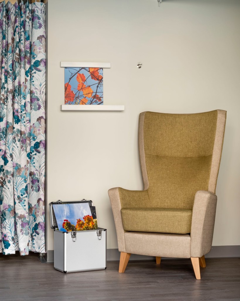 The final images are printed and displayed in eight patient bedrooms using bespoke interchangeable frames, allowing patients to choose from twenty finalised photographs. The work is also produced in the form of a book for both patients and their families for use in the bedrooms and day room.